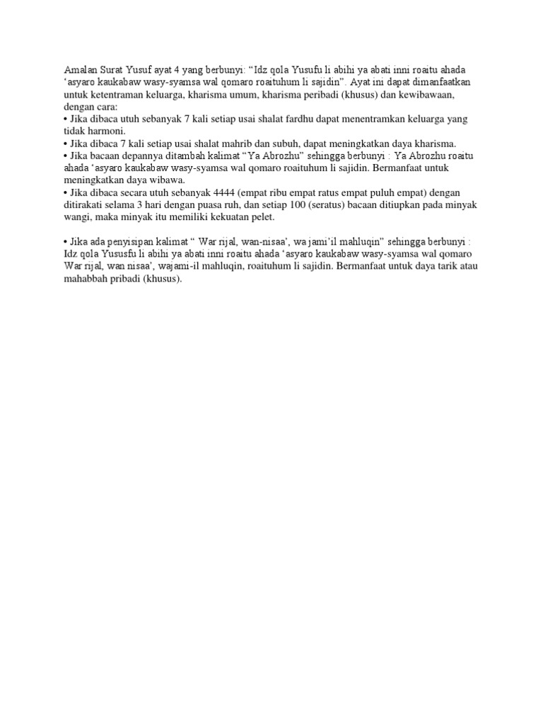 Amalan Doa Surah Yusuf Ayat 4 - Muhasabah: Amalan surat yusuf untuk memikat jodoh ... : Amalkan doa dari surah yusof ini kalau nak wajah nampak.. Doa dan amalan surat yusuf ayat 4 dalam quran surat yusuf ayat 4, allah swt berfirman mengenai mukjizat nabi yusuf. Maksudnya, (ingatlah), ketika yusuf berkata kepada ayahnya: Surah yusuf, ayat 4 dibaca sehingga selesai, kemudian berhenti. Jika anda ada pertanyaan masalah amalan doa nabi yusuf ayat 4 diatas, silahkan menghubungi dan bertanya secara langsung pada mbak marta di nomor wa/telp/sms: Diolah dari berbagai sumber, litelatur dan pengalaman.
